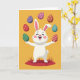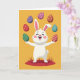 This card shows a fluffy white bunny standing on a small reddish-brown patch of ground with a few simple green grass blades, arms open as if greeting a friend 🐰. Its eyes are gently closed, cheeks are rosy pink, and a wide smile gives it a sweet, affectionate look. Above and around its head, six decorated eggs float in a curved arc, like they’re being tossed with care for someone special. The eggs feature mixed patterns such as stripes, dots, stars, and diamond shapes in purples, reds, greens, and soft blues, creating a lively spring scene 🌷. The bunny’s rounded shape and relaxed pose add a cozy, friendly tone, like a warm hello without needing words. Any greeting text can sit near the top in a simple white font, with a smaller line near the bottom in a matching light color to balance the layout. Behind everything, the background is a solid golden-orange field that makes the pastel details stand out.