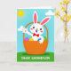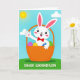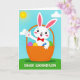 Designed with a bright outdoor scene, this card features a friendly white bunny 🐰 with long ears lined in pink and a wide smile that feels like it’s meant for someone special. The bunny wears a red bow tie and pops up from an orange basket, lifting one paw in a wave, with pink paw pads showing as if greeting a close friend. Tucked inside the basket are smooth egg shapes in purple, yellow, blue, and green, arranged like a shared little treasure haul. Behind them, a sky-blue background fades down into a green field, keeping the setting simple and sunny. A round yellow sun sits in the upper left with two soft white clouds nearby, giving the scene a gentle, day-outside look 🌷. Along the bottom edge, a short message appears in cream-colored letters, centered and easy to read against the background. Subtle shadows sit beneath the basket and bunny, adding a bit of depth while the shapes stay crisp and graphic. The basket’s woven texture is suggested with curved lines, and the eggs peek out at different heights inside the rim.