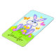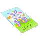A happy cute cartoon bunny with bright butterfly friends and colorful flowers. You can personalize this magnet with your child's name or other text as desired. Use the "customize" feature to change font size, color or style if you like. Have a happy day!