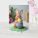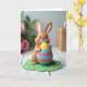 This card features a friendly, humanlike bunny figure in soft brown with a smooth, sculpted look, eyes closed in a wide smile and cheeks tinted rosy 🐰. The bunny hugs an oversized egg close to its chest, as if holding a sweet gift for someone special, with a tender, content posture. The egg is decorated with bright stripes in teal, coral, and light blue, topped by a sunny yellow section dotted with small white circles. Below, the scene sits on a scalloped green mat sprinkled with tiny flower shapes in mixed colors 🌷. A short Easter greeting appears near the top in a light, pastel tone, with smaller words tucked beneath in a slightly darker shade for contrast. Everything rests on a rustic white wooden surface where the grain shows through in soft detail. In the blurred background, you can make out green foliage and pink blossoms on one side, balanced by a muted, light-brown angular shape on the other.