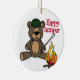 Camping teddy bear cartoon roasting a marshmallow at a campfire.