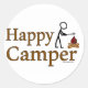 The saying happy camper with a stick figure roasting marshmallows over a campfire.