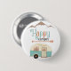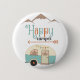 Cute digital art features "Happy Camper" text, Boho style arrow, mountain silhouette and retro style RV travel trailer