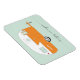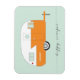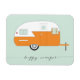 This magnet features an original illustration by Charming Ink of a retro camper, also known as a caravan. Bright and colorful, with an orange and aqua color palette. The script font proclaims — happy camper.