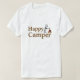 The saying happy camper with a stick figure roasting marshmallows over a campfire.