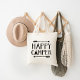 Custom printed tote bags with trendy black and white "Happy Camper" typography quote. Design features a tribal arrow border and cute teepee graphic. Use the design tools to choose any background color, add your own text and photos to create a unique one of a kind design.