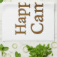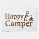 The saying happy camper with a stick figure roasting marshmallows over a campfire.