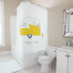 This shower curtain features an original illustration by Charming Ink of a yellow retro camper, also known as a caravan. The script font proclaims — happy camper. Change the message or personalize with names.