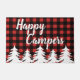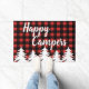 Rustic and bold happy campers doormat featuring a buffalo check plaid pattern and white tree silhouettes.