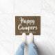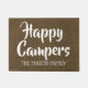 Fun, rustic country burlap outdoor decor gift for retired couples, hikers, rvers, campers, and nature lovers- Personalized, shabby brown burlap fabric look doormat reads 'Happy Campers' in bold, handwritten look lettering and text template below for adding family name (or any custom text) below in white, elegant lettering. Great retirement gift, too. Would look perfect in front of an RV or cozy log cabin to welcome guests.