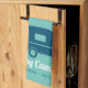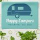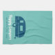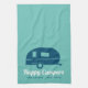 A cheerful kitchen towel, perfect for your camper or RV. Shown with a teal background and navy blue colored camper design with the phrase "Happy Campers". Customize your family name to make it one of a kind. Background color can also be changed to match your decor and preferences.