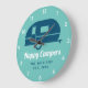 A cheerful wall clock, perfect for your camper or RV. Shown with a teal background and navy colored camper design with the phrase "Happy Campers". Customize your family name to make it one of a kind. Background color can also be changed to match your decor and preferences.