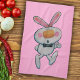 This kitchen hand towel is vibrant pink with a happy cartoon thumbs up bunny wearing a black bow tie with rosy pink cheeks.