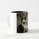 Our two-tone coffee mug features an adorable couple of happy cats posing for the camera, perfect for cat lovers and coffee enthusiasts.