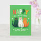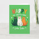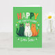 Designed with three stylized cats sitting side by side on a solid green background, the scene nods to St. “Catty’s” Day with a cozy, friendly closeness between the trio 💚. On the left is a dark emerald cat with big yellow eyes and rosy cheeks, angled slightly toward the middle like it’s leaning in for company. In the center, a white cat dotted with green polka dots smiles gently, its posture relaxed as if sharing the spotlight with its neighbors. On the right, an orange tabby with soft stripes completes the row, looking content and warmly included ☘️. Across the top, “HAPPY ST. CATTY’S DAY” curves in an arch, with “HAPPY” in rounded letters that shift from orange to green to white. Small starry flower shapes in white, yellow, and muted green are sprinkled around the headline and near the cats. Near the bottom, “Little Sister” appears in white, placed under the cats, with faint shading beneath their bodies to give a slight lift from the flat green field.