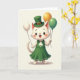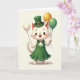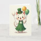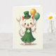 The front design shows an anthropomorphic white cat in a 3D style centered on a pale, softly lit background, giving the scene a gentle, airy look. The cat wears an emerald-green dress with a crisp white shamrock on the front and a matching green top hat topped with a gold buckle, adding a festive St. Patrick’s Day touch ☘️. Its rosy cheeks, bright eyes, and open smile feel like it’s grinning at a close friend just out of view, as if sharing a private joke. Soft, diffused light smooths the cat’s porcelain-like fur and creates light shadows under the dress and around the hat brim. The greeting “Happy St. Patrick’s Day” sits near the top in green lettering, standing out clearly against the pale backdrop 💚. A smaller line of text appears near the bottom in a lighter green, tucked neatly beneath the character without crowding the scene. In one paw, the cat holds three balloons—white, orange, and green—floating upward with thin strings that curve gently above its shoulder.