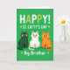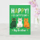 This card features three stylized cats lined up shoulder to shoulder against rolling bands of green that fade from darker to lighter tones, like a soft hillside backdrop 💚. At the top, rounded lettering in a light cream shade reads “HAPPY! ST. CATTY’S DAY,” with small shamrocks tucked around the words ☘️. On the left stands an emerald green cat with faint darker stripes, bright yellow eyes, and rosy cheeks, looking outward with a gentle, inviting smile. In the middle, a white cat with lime-green patches leans into the group visually, its tiny upturned mouth and wide eyes giving it a tender, friendly presence. On the right, a marmalade orange cat completes the trio, its striped tail curling slightly as if it’s edging closer to the others. Beneath the cats, the words “Big Brother” appear in a simple dark green line of text, flanked by two small shamrocks. The overall scene keeps the details smooth and graphic, with the cats’ matching yellow eyes and small smiles creating a cozy, affectionate togetherness. The shamrock accents repeat near both the headline and the “Big Brother” line, echoing the green waves behind the trio.