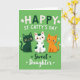 This card shows three stylized cats sitting side by side on a rich green background, leaning close as if they’re sharing a friendly, affectionate moment 💚. On the left is an emerald-green cat with wide golden eyes, in the middle a white cat dotted with forest-green spots and warm amber eyes, and on the right an orange tabby with bright aqua pupils, all facing forward with small, gentle smiles. Above their heads, the phrase “HAPPY ST. CATTY’S DAY” stretches across the top in rounded letters that alternate between soft pinkish-white and deep green ☘️. Near the bottom, the words “Sweet Daughter” appear centered in white, written in a flowing, cursive-style font. The cats’ shoulders nearly touch, and their calm expressions make the trio feel close-knit, like a cozy family photo. Around them, tiny asterisks and starbursts in white and light green dot the background, with a few shapes hinting at shamrocks. The green field is evenly filled with these small marks, framing the cats and the text without crowding the scene.