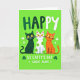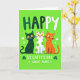 This card shows three cartoon cats lined up across the lower middle on a bright green background, like they’ve squeezed together for a friendly photo 💚. On the left is a deep emerald cat, in the center a white cat with lime-green spots, and on the right a ginger-orange cat, all with wide daffodil-yellow eyes and small pink smiles that feel warmly welcoming. Their close spacing and matching expressions give the scene a cozy, companionable feel, as if they’re sharing a private joke between friends. Near the top, the word “HAPPY” sits centered in rounded white letters with a darker green shadow behind it. Beneath the cats, “ST. CATTY’S DAY GREAT AUNT” is written in the same rounded white lettering, stretching across the lower area. Small shamrocks in different greens and a few in white are scattered around the cats and text, adding a festive touch ☘️. The overall layout stays simple and bright, with the cats as the focus and the clovers sprinkled across the green field.