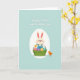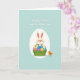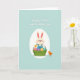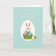 Designed with a soft, gentle illustration style, this Easter card centers on a cream-furred bunny with pink-lined ears and rosy cheeks, giving a tender, friendly look 🐰. The bunny wears blue overalls and cradles a bright green basket filled with patterned egg shapes in mixed pastel tones, like a small gift being offered. A tiny orange chick stands to the right, angled toward the bunny as if sharing a quiet, curious moment between close companions 🐇. The main figures sit inside a large white egg-shaped frame that keeps the focus snug and intimate. The background is a pale teal field that makes the lighter colors stand out without feeling loud. Near the top, two lines of white flowing lettering carry the Easter greeting, centered above the scene and easy to spot. Subtle shading on the eggs adds a little depth, and the basket’s handle curves upward in front of the bunny’s overalls. A few small decorative dots and simple shapes sit around the egg frame against the teal backdrop, like scattered confetti 🌷, and the chick’s beak and feet are a warm golden tone.