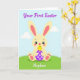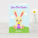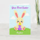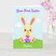 This card shows a creamy, long-eared bunny-like creature 🐰 sitting calmly on bright green grass, with big shiny eyes, long lashes, and rosy cheeks that make its gaze feel tender and attentive. It hugs a purple oval egg covered in small white dots, held close like a shared secret between friends. A tiny yellow chick perches on top, leaning forward as if keeping the bunny company, its little orange feet planted near the egg’s curve. Behind them, a light blue sky stretches across the background with soft white cloud shapes drifting near the top. The artwork uses smooth, flat shapes and gentle pastel tones, with the yellow chick and purple egg adding stronger color contrast. A short Easter greeting is placed in an arc along the upper edge in purple lettering, while a smaller line of white text sits below the bunny on the green area, like a quiet note meant just for someone special 🌷. The bunny’s ears rise tall with pale pink inside, and the dotted egg sits centered in its lap beneath the chick.