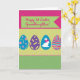 Designed with cheerful horizontal bands, this Easter greeting card sets a friendly, affectionate tone right away 🐰. Across the top, a fuchsia gingham-like panel holds a bright lime-green banner with a thin outline, and the message appears centered on it in fuchsia lettering. The middle features a wide, pale yellow-green stripe with a light diagonal texture, where four decorated oval shapes sit side by side like shared little keepsakes between close friends. One oval is soft blue with pink and yellow flowers, another is deep purple with scattered yellow geometric bits, and a teal one shows a white long-eared bunny shape with a fuchsia bow on its ears 🐇. The fourth oval is filled with wavy stripes in pink, blue, green, and purple, adding a lively rhythm next to the calmer patterns. A neat row of small pink dots runs horizontally beneath the ovals, acting like a gentle divider that keeps the layout tidy. At the bottom, a darker green band with a faint grid texture anchors the design under the dotted line.
