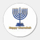 Happy Chanukah text in gold with a blue menorah.