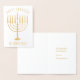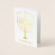 Send your loved ones a personalized foil card this Chanukah season. This design features a gold foil menorah. Above it the message reads "Happy Chanukah". Below the menorah is a place for your family name which you may personalize or remove if you'd like. Inside of the card reads "Wishing you peace, love, and joy this Chanukah season" which may be kept as is or personalized to your own liking. Also, there is a place for your signature. Designed by artist Tim Coffey.
