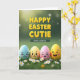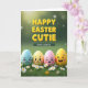 This card shows four egg-shaped characters lined up side by side in soft pastel tones—sky blue, pale yellow, rose pink, and warm golden yellow—resting on fresh green grass sprinkled with tiny white daisies 🌷. Each face tells a little story: one looks teary-eyed, another wide-eyed with surprise, a third gives a flirty wink, and the last beams with a big grin, as if sharing a private joke with a friend 🐰. The way they lean close together makes the scene feel like a small group caught in a tender, friendly moment. Across the top, chunky golden letters sit prominently and read like a festive Easter greeting, catching the light as if slightly raised. Below that, a long, slim banner stretches across the middle with a shorter message in a softer, muted tone that doesn’t compete with the headline. Gentle morning-style lighting washes over everything, and the background fades into a blurred, glowing garden look that keeps attention on the characters. Dewy blades of grass and scattered daisies with sunny yellow centers fill the lower portion of the design.