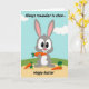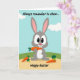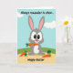This card features a wide-eyed gray bunny 🐰 sitting upright at center, nibbling an orange carrot that highlights its front teeth and a friendly, toothy grin. Its bright gaze and relaxed posture feel like a sweet, inviting moment shared with someone close, as if it’s pausing mid-snack to make you smile back. Behind it, a pale blue sky with rounded white clouds stretches over a gently sloped green hill, leading down to a sandy-tan ground. Near the bunny’s feet, two more carrots rest on the ground, one topped with leafy greens and the other with a rounder, textured green cap. At the top, a short line of text is placed above the bunny in a dark, flowing cursive-style font, like a light instruction hovering in the sky. Along the bottom, a seasonal greeting appears in a larger, easy-to-read font in a darker color that stands out against the tan foreground, with a small 🌷 detail nearby. Crisp outlines and flat areas of gray, orange, green, blue, and white keep the scene simple, with the bunny’s carrot held close to its mouth and the extra carrots angled slightly toward its paws.