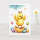 This design shows a fluffy yellow chick standing proudly on a cracked golden eggshell, wearing a tiny shiny crown like a little royal. Its soft feathers catch warm light, and its outstretched wings and open beak make it look like it’s chirping to someone just off to the side, as if sharing a friendly hello. Big dark eyes glint with a tender, welcoming look that feels like an invitation to join the celebration 🐣. The background stays mostly white with gentle shading, giving the scene lots of airy space. Around the chick, pastel eggs in pink, blue, lavender, and mint sit near the shell while a few appear to float above, adding a light, springy motion 🌷. A short greeting appears near the top in a soft gray tone, centered and easy to spot without crowding the artwork. A faint blue watercolor wash stretches across the upper area like a calm sky, fading softly into the white.