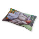 Vivid colors, and soft, plush fabric! I was extremely happy with this purchase. The print I chose worked on the large dog bed beautifully, and is a perfect match for our home tiki bar. Our dogs look so stylish lounging in here with us, and they love the soft fabric. My only minor critique would be that the stuffing inside is a little on the thin side, and becomes flat very easily. It's an extremely easy fix to add more stuffing, or do what we did and add a stuffed rectangle crate liner inside the cover underneath the existing stuffing - works perfectly! The printing turned out better than I could've imagined. I was extremely impressed with how well the colors turned out and how the design looked.