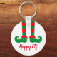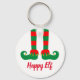 Happy Christmas elf keychain with custom text. Personalized Holiday party favor for kid's and adults. Cute xmas design with elf's feet.
