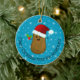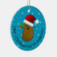 Happy Christmas Potato wearing a red Santa hat with a white fur trim and a white fluffy pompom. His body is brown with small black dots for eyes and a big happy smile. He has sticks for arms and is holding green holly leaves with red berries. Behind him is a blue background with white sparkling snowflakes. Below the potato is a template in black type for you to add your own text to personalize this Christmas Ornament.