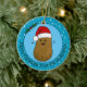 Happy Christmas Potato wearing a red Santa hat with a white fur trim and a white fluffy pompom. His body is brown with small black dots for eyes and a big happy smile. He has sticks for arms and is holding green holly leaves with red berries. Behind him is a blue background with white sparkling snowflakes. Below the potato is a template in black type for you to add your own text to personalize this Christmas Ornament.