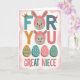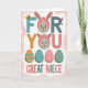 This card features a cheerful digital illustration laid out like a greeting-card front, with a friendly, affectionate mood. Across the center, a three-line message stretches in large, thick lettering, each line in a different bright color, and the text sits in neat horizontal bands. The first letter on the top line wears a small golden crown, giving the reader a sweet “you’re special” touch without saying it outright. Cute rabbit faces 🐰 appear tucked into the top line and again in the next line, each with long ears, wide eyes, and a gentle smile inside soft pink circles, like little companions cheering the message along. Near the upper text, a slim pink cocktail glass rests on top of one of the letters, adding a light celebratory twist that feels a bit grown-up and flirty. Below the wording, four egg-shaped decorations line up in a row, patterned with dots and stripes in pastel golden-orange, teal, and blush pink, like shared treats set out for someone you care about 🌷. The background is filled with flowing pale pink and white waves, and the rabbits’ faces sit inside round pink frames between the colored lines of text.