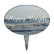 Happy Couple beach themed ocean waves cake picks written in white text. Pretty blue ocean with crushing waves up against the sandy shoreline with a light blue sky and clouds. Personalize text box for Wedding, Anniversary, Birthday, Love, etc. Original Photography Design by TamiraZDesigns.