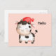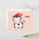 A postcard with an adorable image of a black and white spotted cow wearing a red hat.