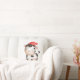 A pillow with an adorable image of a black and white spotted cow wearing a red hat.