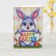 Designed with a front-facing lavender bunny-like creature in a stitched, pixel-style look, this card centers on its long upright ears, pale muzzle, and a rosy nose above an open smile 🐰. Large blue eyes with tiny lash marks and bright highlights give it a tender, friendly gaze, like it’s happily greeting someone it cares about. Behind it, a soft diamond pattern in cream, blush pink, and pale yellow sets a springtime backdrop without stealing attention. The character holds a white banner across the middle, and the greeting text sits centered on it in big letters colored red, orange, green, and blue. A twig-like border wraps the banner, with small green leaves tucked along the edges for a cozy, outdoorsy touch 🌷. Near the bottom, two decorated oval eggs rest on green ground, covered in stripes, dots, and star shapes in orange, red, yellow, and blue. A small blue flower with a yellow center peeks from behind one ear, angled slightly to the side.