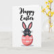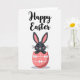 Designed with a cheerful digital illustration, this card features a dark-furred, long-eared bunny popping up from a cracked eggshell 🐰. The bunny’s eyes are gently closed, its grin is wide, and its rosy cheeks and tiny whiskers give it a sweet, friendly look, as if it’s sharing a private joke with someone close. Tall ears with soft pink interiors lift the mood and draw attention upward, adding a light, affectionate energy to the scene 🐇. The eggshell is a warm coral color, decorated with small white polka dots and bow-like bands that wrap around it for a festive touch. The background stays bright white, keeping the focus on the character and the egg’s decorations. A short greeting appears above the illustration in flowing coral lettering, centered near the top of the card. A faint gray shadow sits just under the egg, helping it stand out against the white space.