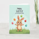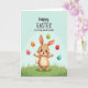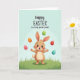 This card features a cheerful long-eared animal standing on a narrow strip of green grass, arms slightly open as if welcoming a friend close 🐰. Its light brown fur has creamy highlights, rosy cheeks, and bright eyes that seem to meet the viewer with an affectionate, friendly look. Five decorated egg shapes float around it in a loose circle, adding a sense of shared celebration like companions gathering nearby. The eggs show gentle patterns and glossy touches in lime green, warm orange, deep red, blush pink, and calm teal. Behind everything is a soft gradient background that shifts from pale blue to blue-green, like an early spring sky 🌷. Near the top, a short Easter greeting sits centered in rounded lettering, colored in a darker green-teal so it stands out against the light background. The bottom edge is grounded by the grassy strip, while the eggs hover at varying heights around the smiling character.
