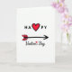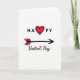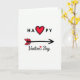 This greeting card features a clever and eye-catching design set against a bright white background. At the center, the word “HAPPY” is split into “HA” and “PY,” with a bold red heart taking the place of the letter in between, creating a sweet and memorable focal point. Beneath it, a strong black arrow with red feather details points downward, guiding the eye to graceful cursive text that reads “Valentine’s Day.” A small red heart replaces the apostrophe, adding a thoughtful and charming detail. The mix of red, black, and white gives the card a striking look that feels warm and expressive. Every element works together to share love in a fun, heartfelt way, making this card perfect for letting someone special know how much they mean to you on Valentine’s Day. 💌❤️🍫