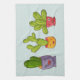 A kitchen towel with a whimsical illustration featuring 3 happy little cacti sitting in their own flower pots. They each have their own unique expressions smiling and looking happy.