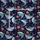 Several happy light blue sharks are included in the pattern on this fun ocean themed fabric. The sharks are accompanied by orange sea shells, jelly fish, and star fish, all in boho style. Everything is placed on a darker blue background. Cute!