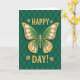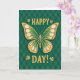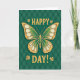 Designed with a striking butterfly centered on a deep green background, this St. Patrick’s Day card feels like a quiet little celebration shared between close friends 💚. The butterfly’s wings mirror each other in rich emerald and lime green, traced with textured gold lines that make it look gently treasured. Inside the gold sections, creamy white oval shapes glow softly, like tiny petals or polished shell catching the light. Above the butterfly, “HAPPY” sits in warm gold lettering, and below it, “DAY!” appears in the same gold, framing the butterfly like a cheerful toast. Small gold four-leaf clovers sit near the words, adding a hint of luck and the kind of sweet nod you’d give someone you care about ☘️. Behind everything, the dark greens form a subtle diamond pattern, like an argyle weave that gives the scene depth without stealing attention. A faint shadow under the butterfly makes it seem to hover just above the patterned green field. Share St. Patrick’s Day sentiments with someone special, surrounded by gold clovers, creamy white wing details, and a deep green diamond-patterned backdrop.