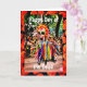 A scary skeleton dressed in colorful ribbons marches in a Dia de los Muertos parade. The parade scene is bordered by marigolds. a traditional flower of the Day of the Dead. Family, friends, neighbors and coworkers will find this a fun card. Purchase through Zazzle's Instant download to print several for invitations, etc. Tell someone to have a "Happy Day of the Dead."