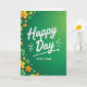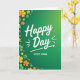 Designed with a rich green gradient background that shifts from bright lime on the right to deep emerald on the left, this St. Patrick’s Day card sets a cozy, celebratory scene 💚. Along the left edge and curling into the bottom-right corner, scattered four-leaf clovers form a flowing border like a gentle path guiding your eyes inward ☘️. The clovers mix sunlit yellow, warm orange, and several greens, layered so they feel softly stacked rather than flat. Tiny golden stars sparkle between them, adding little glints that echo the way close friends or family light up a room for each other. Centered in the middle, the words “Happy Day” appear in white cursive lettering with a subtle shadow, making the message stand out against the green. Near the word “Day,” short white radial lines fan outward, and a thin white arrow runs beneath it, pointing to the right. Under that, “STEP MOM” sits in uppercase white text, aligned below like a steady signature line. The left and bottom-right margins continue to show the clover-and-star border, with the deepest emerald tone resting behind the center text.
