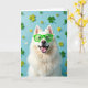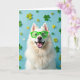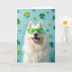This card shows a fluffy white dog, likely a Samoyed, centered like a cheerful portrait and looking straight at you as if it’s sharing a friendly grin. The dog wears slatted green novelty glasses that sit across its face like a fun holiday accessory, adding a flirty wink of charm without needing any extra characters. Its mouth is open in a big smile, teeth showing with a small pink tongue peeking out, the kind of expression that feels like an eager greeting between close friends. The thick white fur is detailed and soft-looking, catching bright light that also highlights a glossy black nose and the green frames. Behind the dog is a pale, airy blue background sprinkled with shamrocks and small yellow flower shapes, giving the scene a St. Patrick’s Day lift ☘️. The main text sits near the top in green lettering, easy to spot against the light blue, with a smaller line of matching text near the bottom to balance the layout 💚. Shamrocks and tiny yellow blooms float around the dog at different sizes, with the crispest shapes nearest the center and softer ones fading toward the edges.