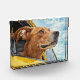 This detailed art print captures a happy dog enjoying the breeze as it looks out from a yellow car. The artwork radiates a sense of freedom and joy, perfect for animal lovers looking to add a cheerful and uplifting piece to their decor. Celebrate the bond between humans and their canine companions with this heartwarming image.